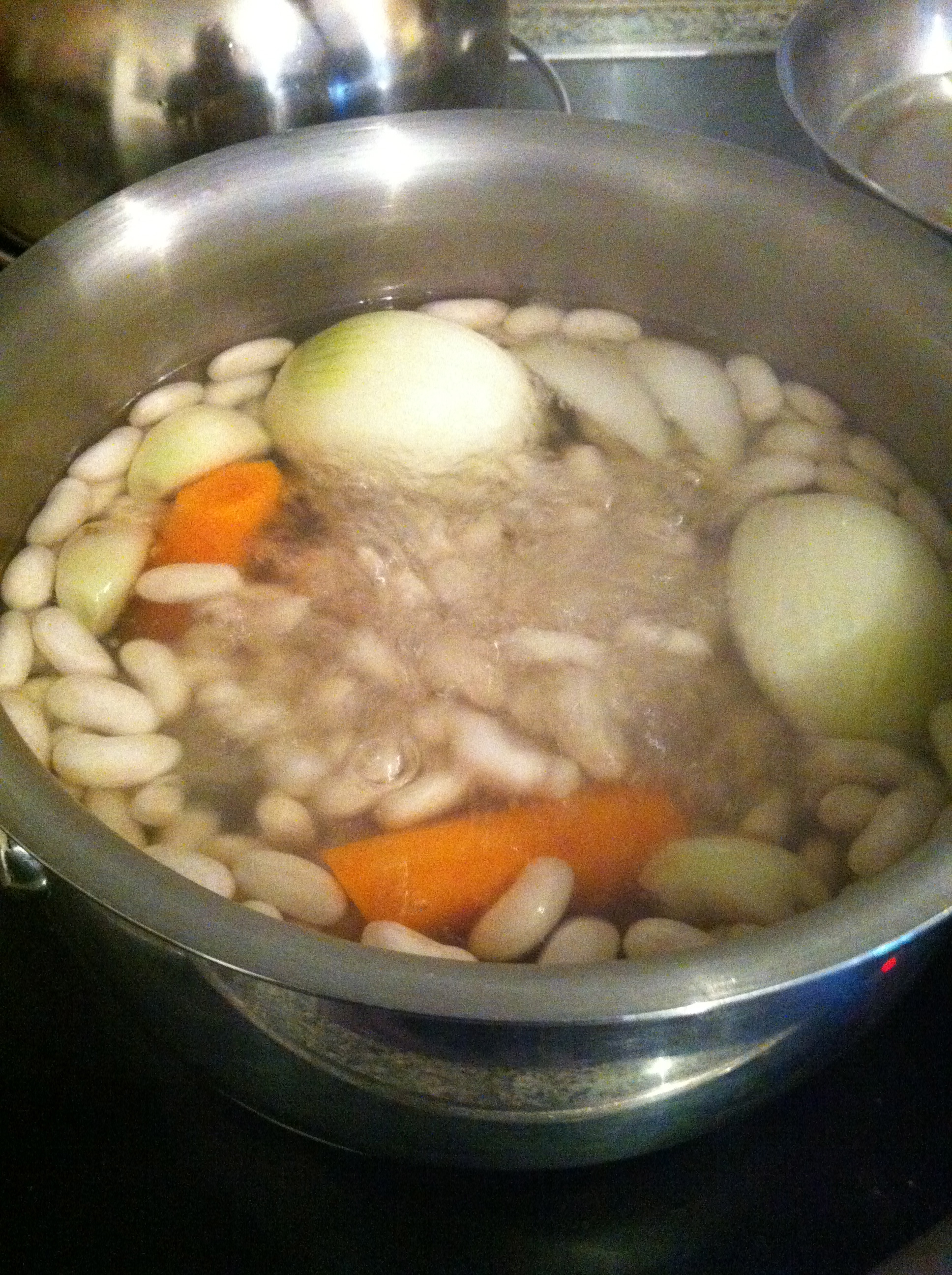 It’s really simple – bring the beans, onion, carrot, garlic head, 1 teaspoon salt, bay leaves, and 6 cups water to a boil in a large saucepan over medium-high heat. Reduce the heat to low, partially cover, and simmer, stirring occasionally, until the beans are almost tender, 1 to 1 ¼ hours, adding more water if necessary. (I think if you soak the beans for a few hours first, it makes this part go a little more quickly – I soaked mine the second time I made this and it resulted in maybe 20 minutes less cooking time. Also, I peeled my onion. Nothing bad happened because of it.) Here is a picture of mine, simmering away, although you can’t see the garlic. It should smell similar to chicken soup at this point: